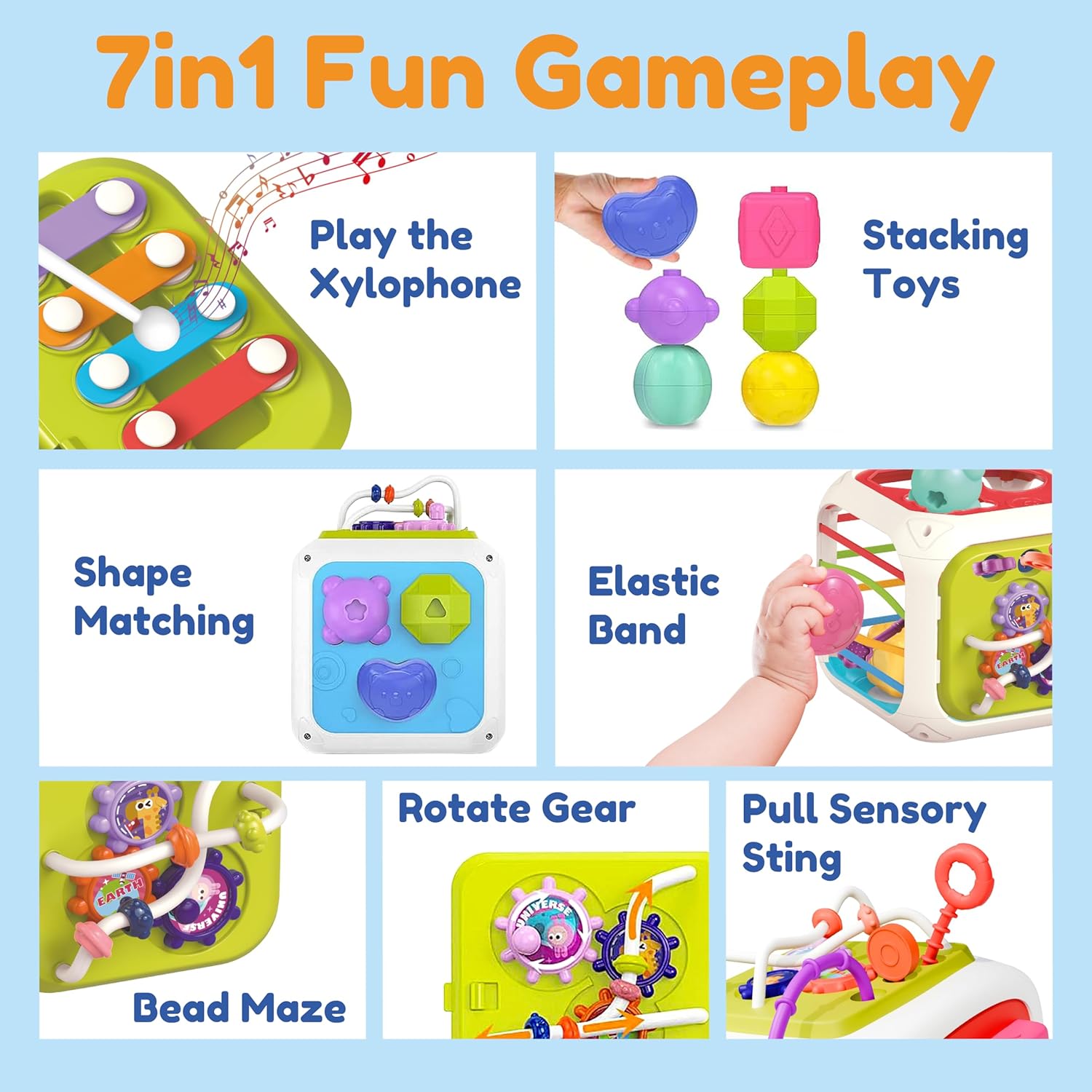 7 in 1 Toddler Toys: This interactive toy allows your kids to play 7 games in 1 toy: baby xylophone, rotating beads, shape sorter, spinning gears, pull string activity, sorting & stacking blocks,colorful elastic pull strings put in and take out block. The multi-functional baby activity cube toy will attract their attention for hours as they will rotate from one side to another.