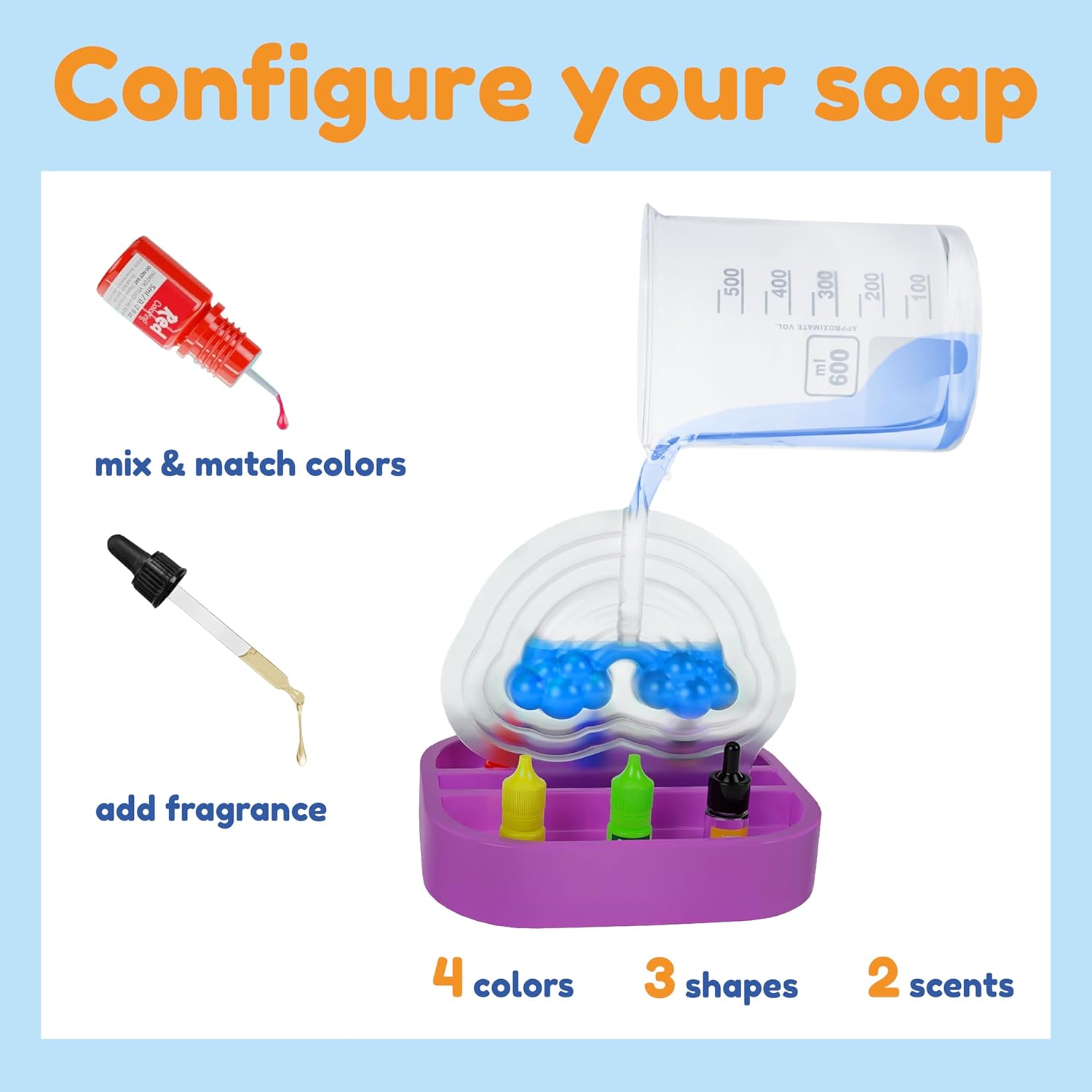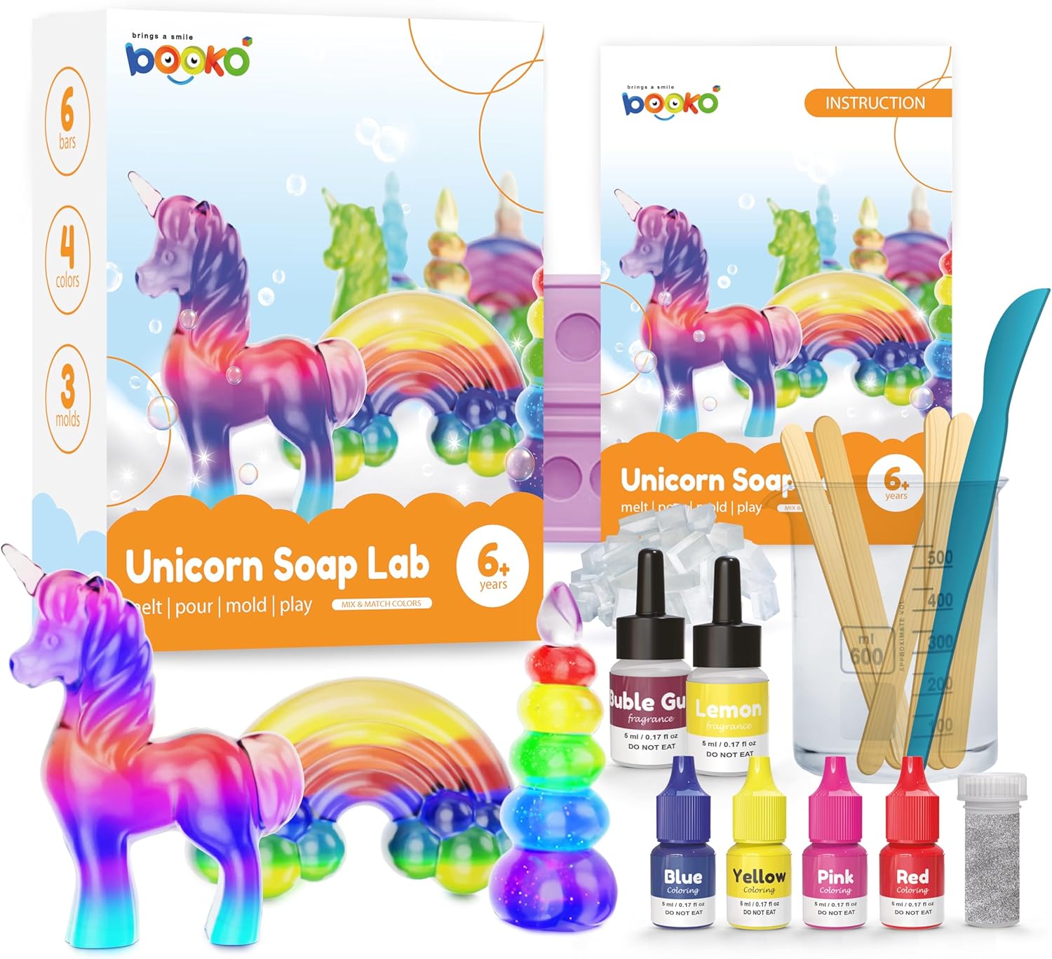 KIT INCLUDES: 6 soap-base blocks, 2 fragrances (lemon, bubble gum), 4 liquid colors (red, blue, yellow, pink), glitter, 3 soap molds (Unicorn, Rainbow, Unicorn Horn), beaker, 6 pop sticks, working tray, trimming tool, and beautiful instruction guide.